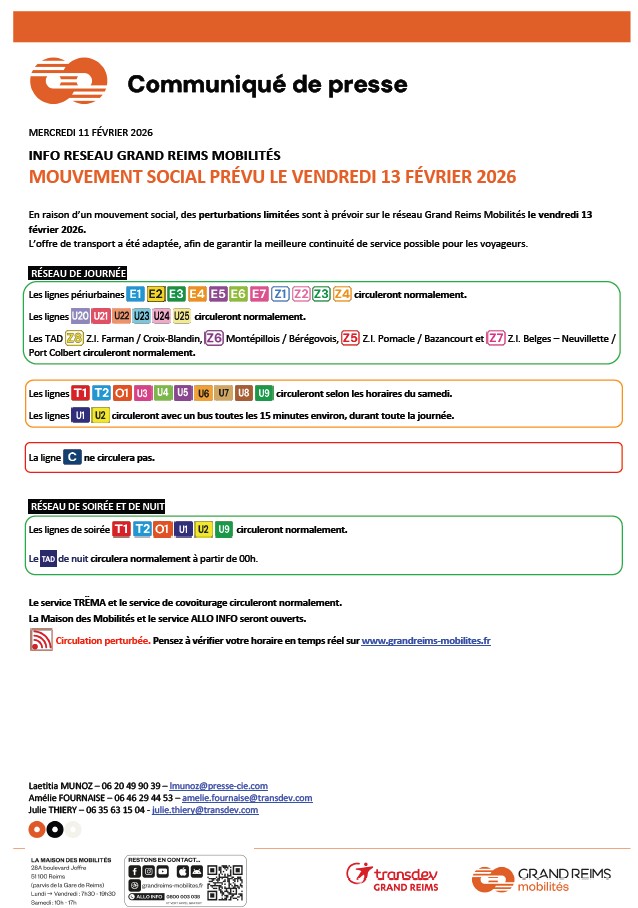 Grand Reims Mobilités nous informe d’un mouvement social pour les transports en commun de la région rémoise pour la journée du 13 février 2026.