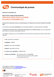 Grand Reims Mobilités nous informe d’un préavis de grève pour les transports en commun de la région rémoise pour la journée du 24 novembre 2025.